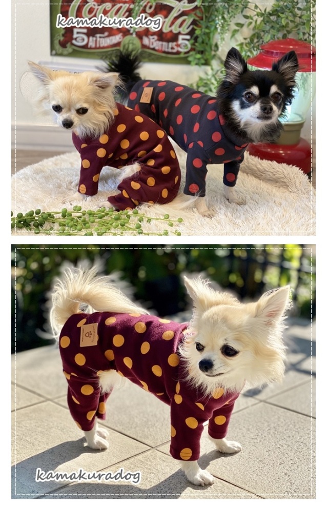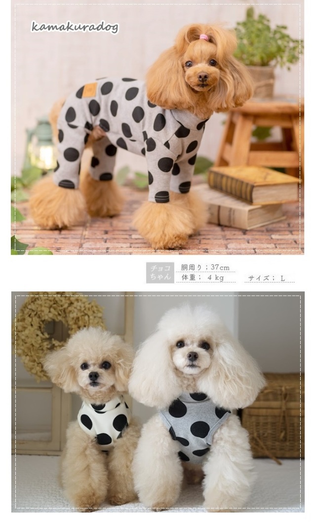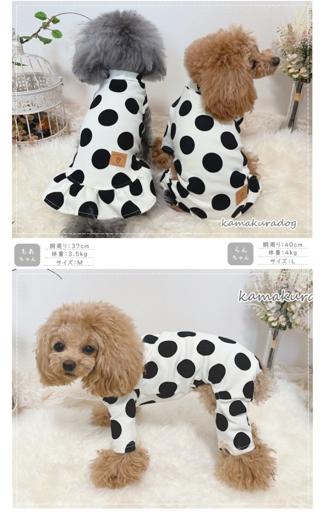 洋服のデザイン、また愛犬の個体差や毛量によって若干サイズが異なる場合がございますので、事前にワンちゃんのサイズを測った上でご検討下さい。