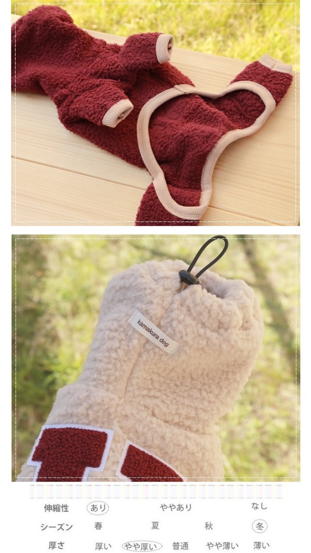 洋服のデザイン、また愛犬の個体差や毛量によって若干サイズが異なる場合がございますので、事前にワンちゃんのサイズを測った上でご検討下さい。