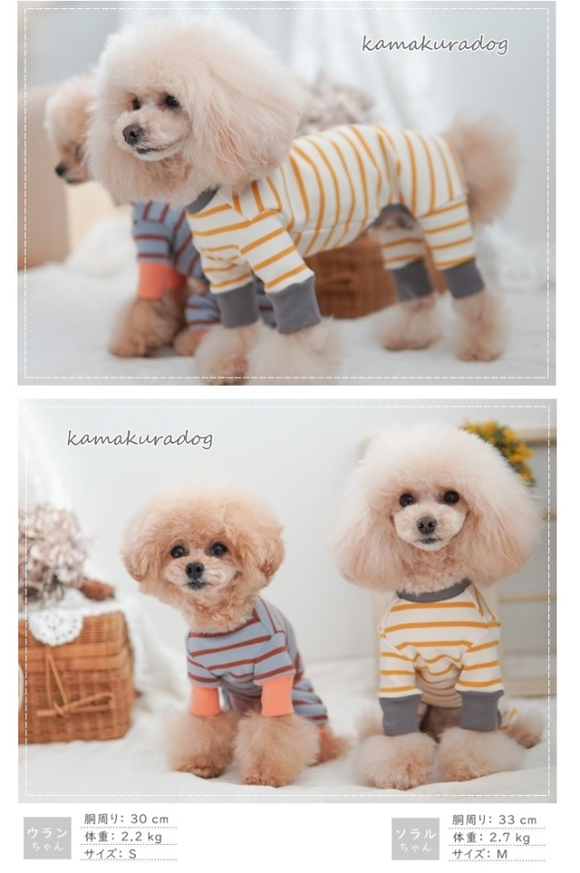 洋服のデザイン、また愛犬の個体差や毛量によって若干サイズが異なる場合がございますので、事前にワンちゃんのサイズを測った上でご検討下さい。