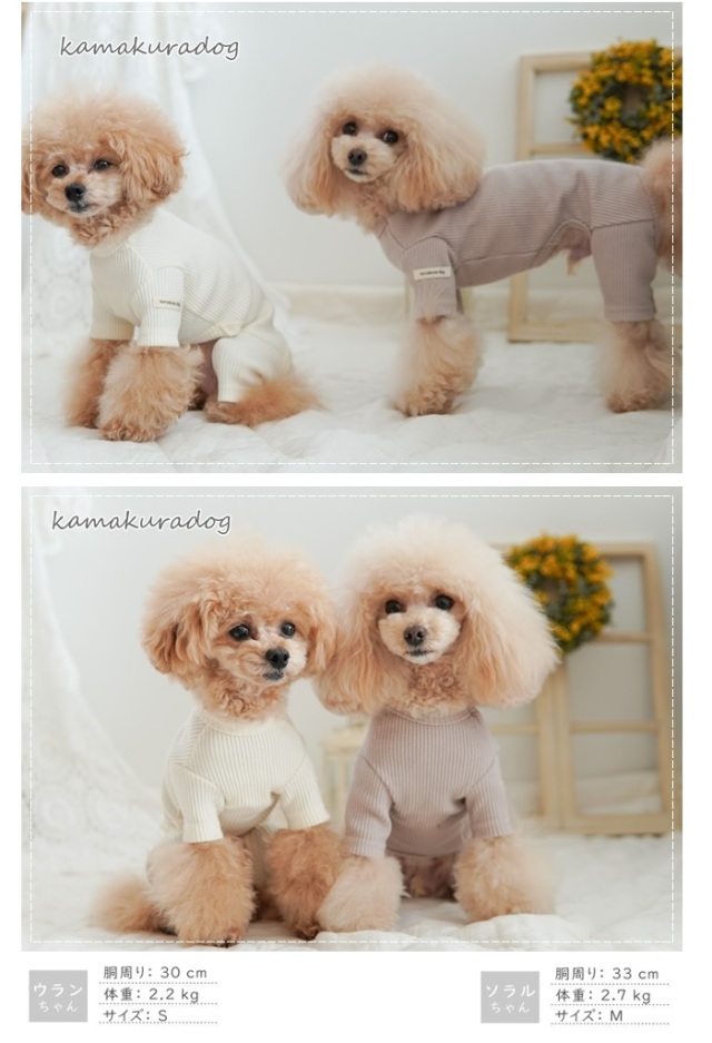 洋服のデザイン、また愛犬の個体差や毛量によって若干サイズが異なる場合がございますので、事前にワンちゃんのサイズを測った上でご検討下さい。