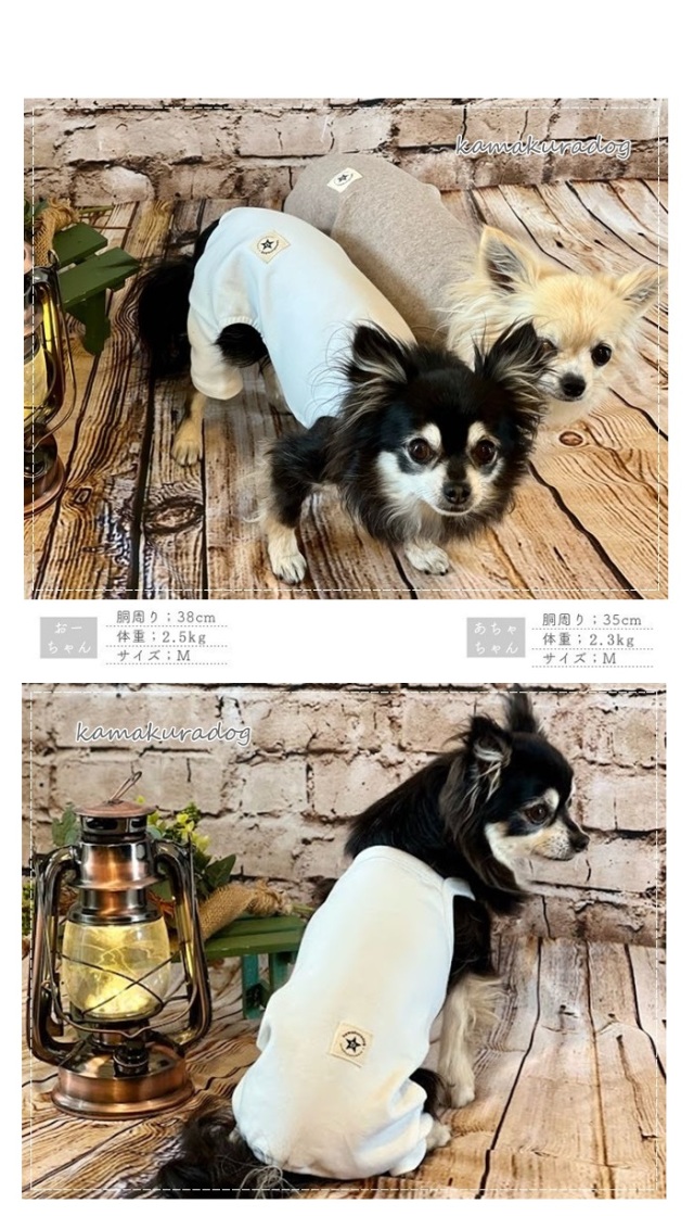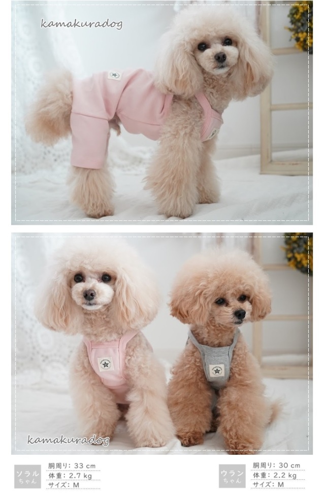 洋服のデザイン、また愛犬の個体差や毛量によって若干サイズが異なる場合がございますので、事前にワンちゃんのサイズを測った上でご検討下さい。
