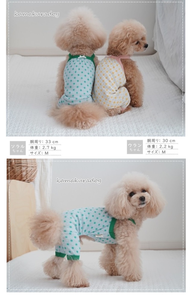 洋服のデザイン、また愛犬の個体差や毛量によって若干サイズが異なる場合がございますので、事前にワンちゃんのサイズを測った上でご検討下さい。