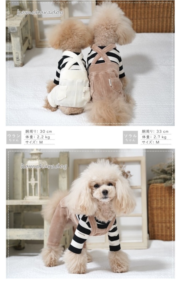 洋服のデザイン、また愛犬の個体差や毛量によって若干サイズが異なる場合がございますので、事前にワンちゃんのサイズを測った上でご検討下さい。