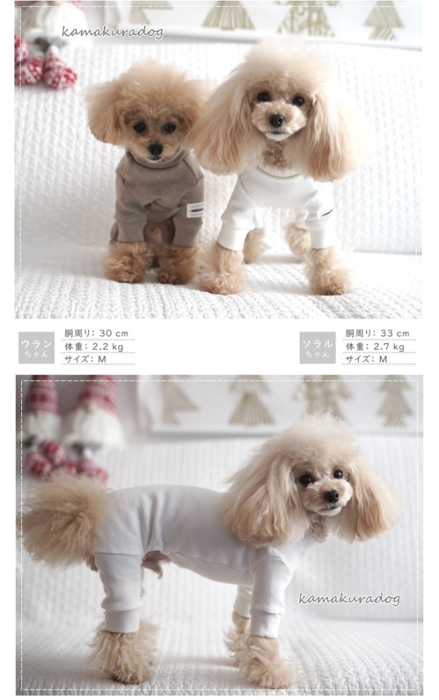 洋服のデザイン、また愛犬の個体差や毛量によって若干サイズが異なる場合がございますので、事前にワンちゃんのサイズを測った上でご検討下さい。