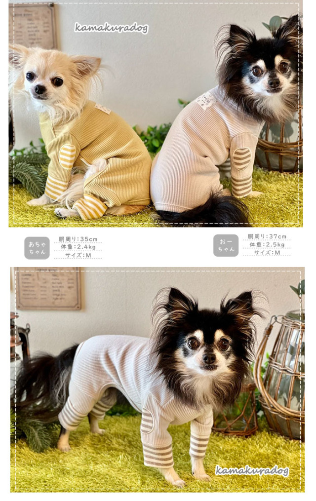 洋服のデザイン、また愛犬の個体差や毛量によって若干サイズが異なる場合がございますので、事前にワンちゃんのサイズを測った上でご検討下さい。