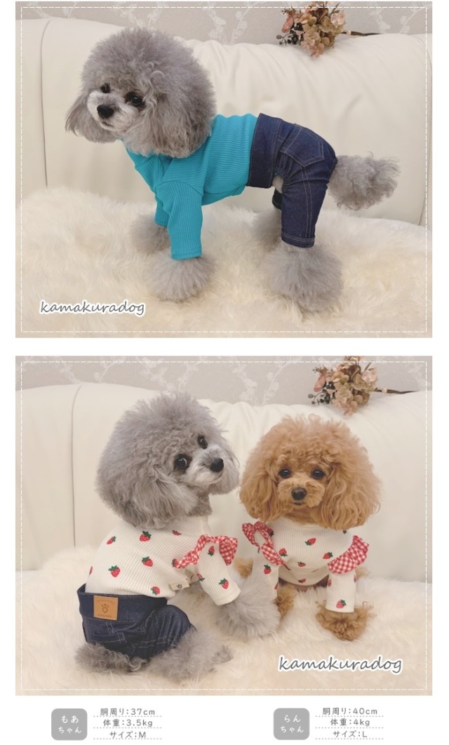 洋服のデザイン、また愛犬の個体差や毛量によって若干サイズが異なる場合がございますので、事前にワンちゃんのサイズを測った上でご検討下さい。