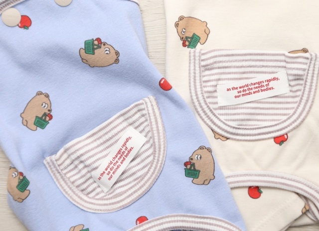 買い物かごを持ったくまさんと、ころんとしたりんごのイラストがかわいらしいデザインです。