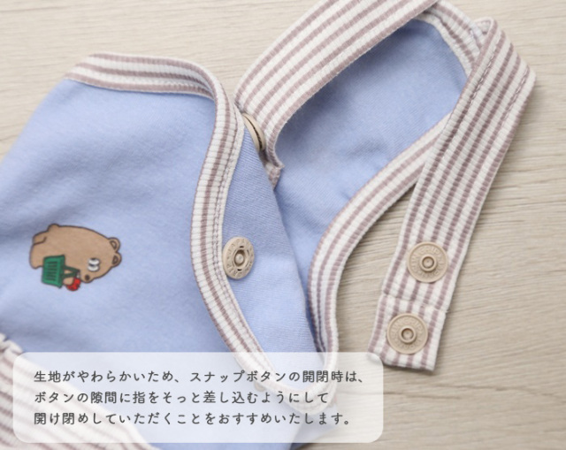 *生地が柔らかいため、スナップボタンの開閉時は、ボタンの隙間に指をそっと差し込むようにして 開け閉めしていただくことをおすすめいたします。