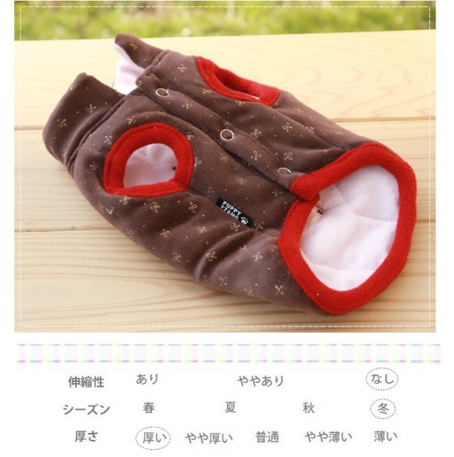 洋服のデザイン、また愛犬の個体差や毛量によって若干サイズが異なる場合がございますので、事前にワンちゃんのサイズを測った上でご検討下さい。