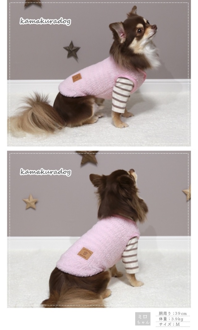 洋服のデザイン、また愛犬の個体差や毛量によって若干サイズが異なる場合がございますので、事前にワンちゃんのサイズを測った上でご検討下さい。