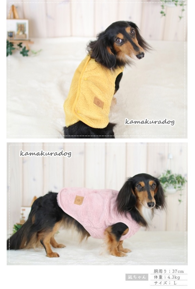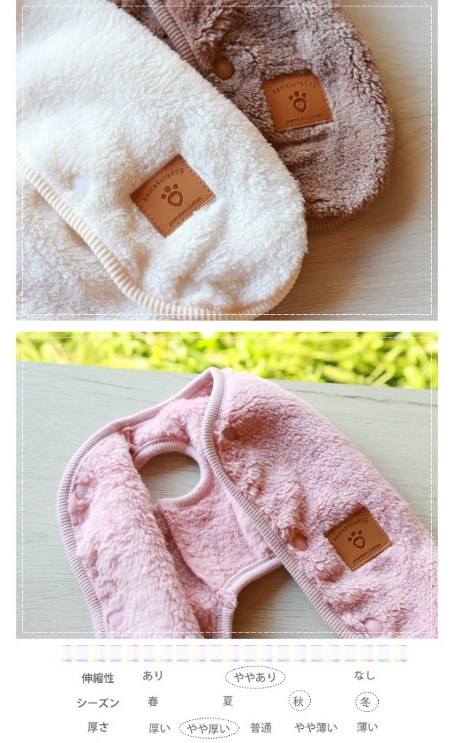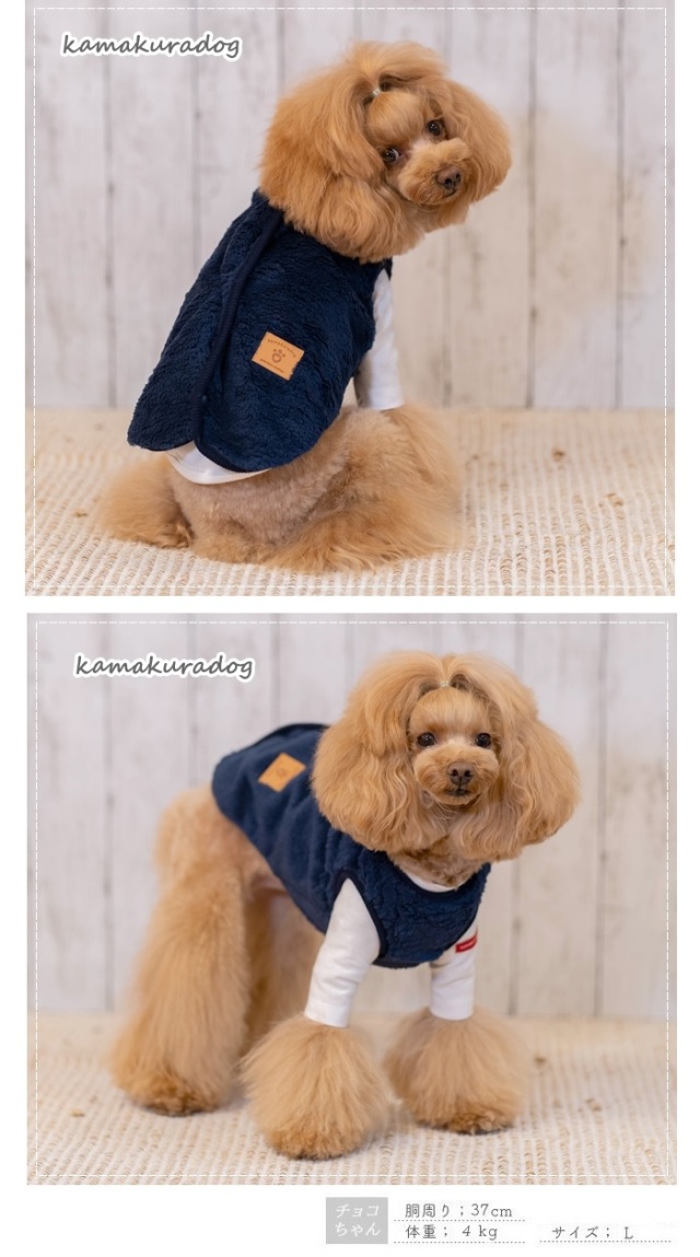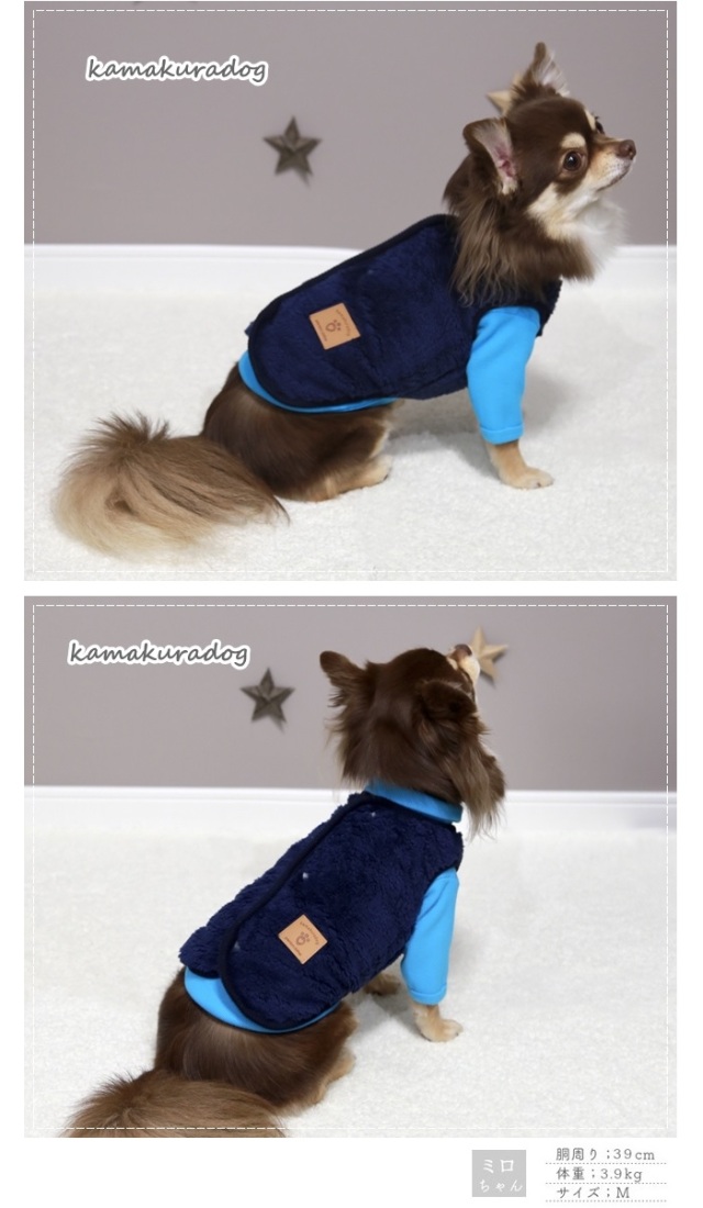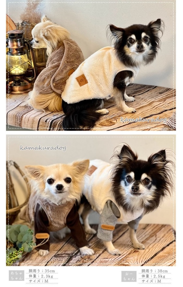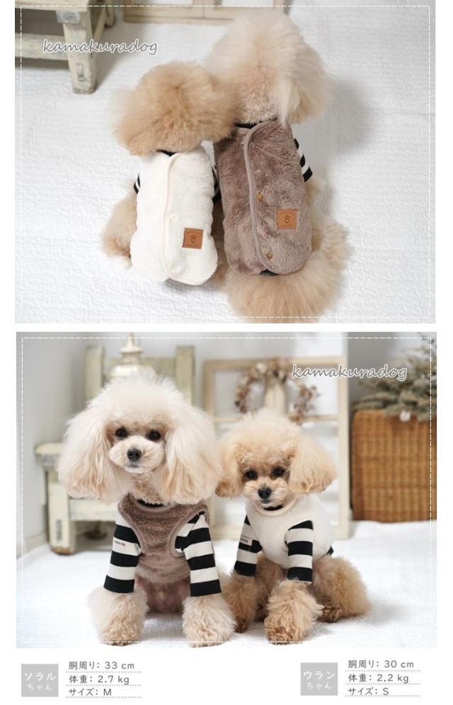 洋服のデザイン、また愛犬の個体差や毛量によって若干サイズが異なる場合がございますので、事前にワンちゃんのサイズを測った上でご検討下さい。
