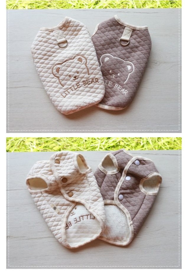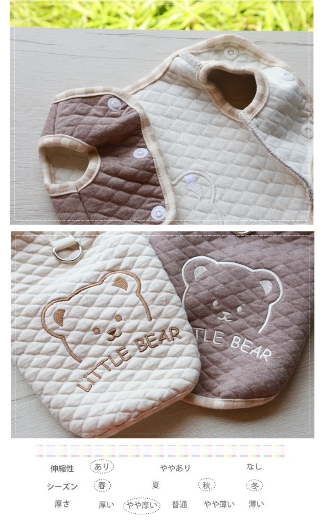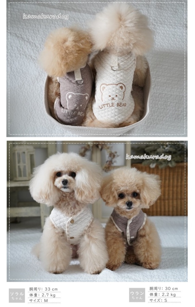 プードルのつなぎとベストを購入しましたが、つなぎはよく伸びる素材で、窮屈感が無いので我ながら良い買い物をしたと満足しています。 今うちの子は7.5キロくらいあるのですが、胴長なのか、ベストは少し着丈が短く、パツンパツンでボタンを閉めるのに若干苦労しますが、寒くて伸び切った毛を短くしたら、少しは余裕が出来るかもと思っています。 いずれにしても、デザインと素材が気に入っているのでまた利用したいと思います。 |