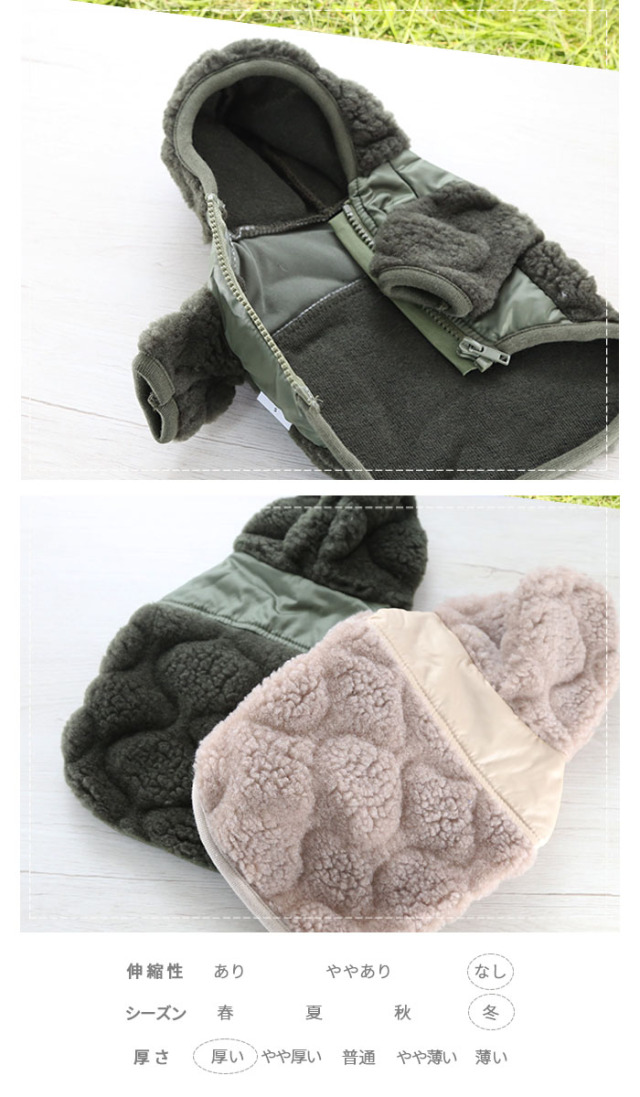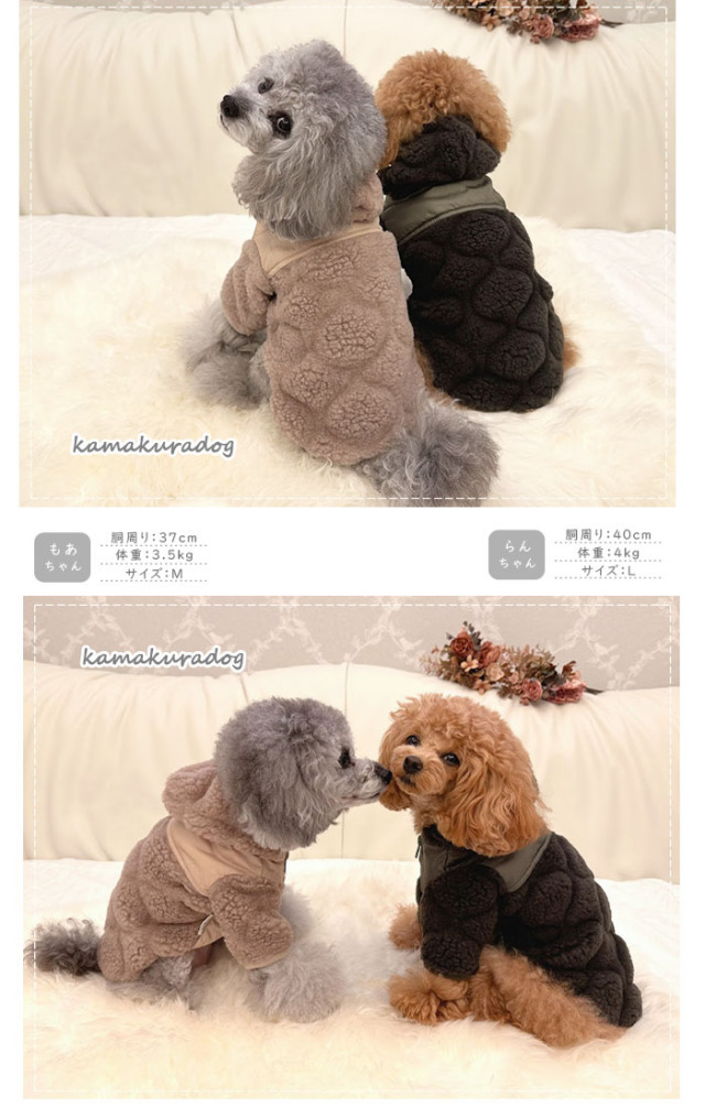洋服のデザイン、また愛犬の個体差や毛量によって若干サイズが異なる場合がございますので、事前にワンちゃんのサイズを測った上でご検討下さい。