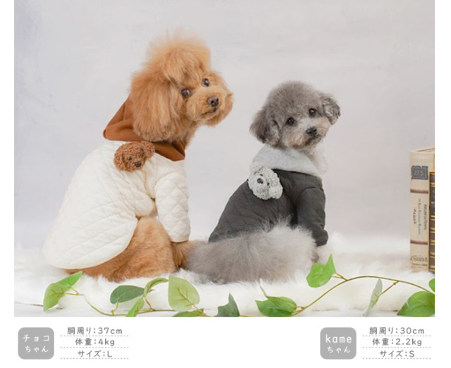 洋服のデザイン、また愛犬の個体差や毛量によって若干サイズが異なる場合がございますので、事前にワンちゃんのサイズを測った上でご検討下さい。
