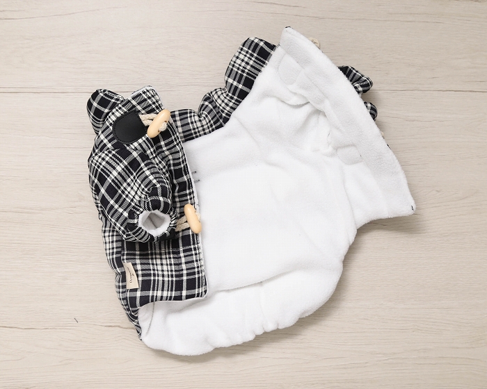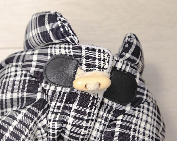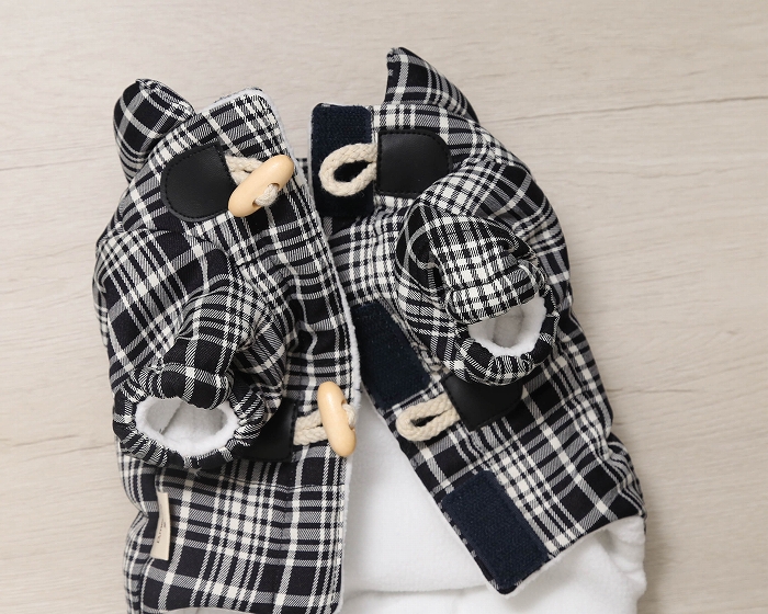 本格派のトグルボタンと内側はマジックテープで簡単着脱。しっかり留まってずれにくいので、お散歩中も安心です。