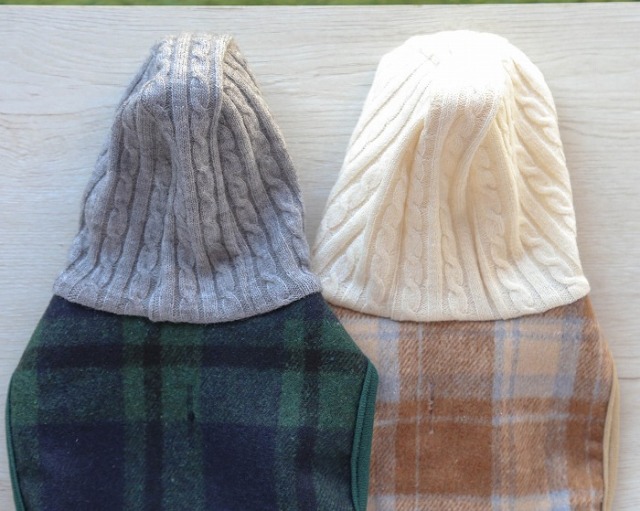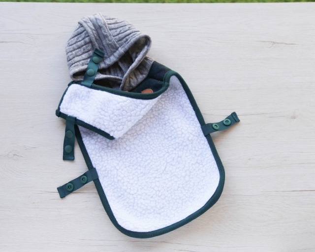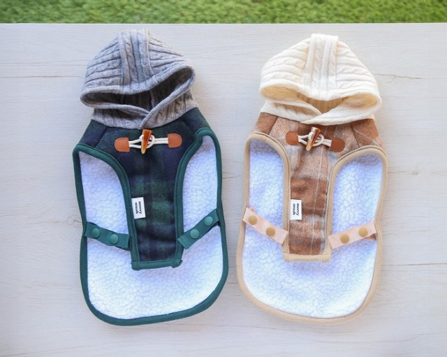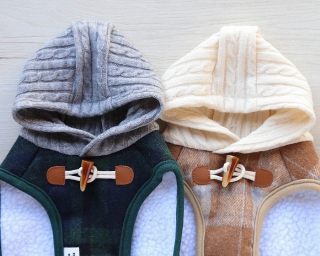 落ち着いたチェック柄に、ケーブル編み風のフードを組み合わせた上品なデザイン。写真映えも◎。便利なリードホール付き。