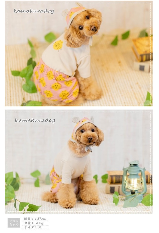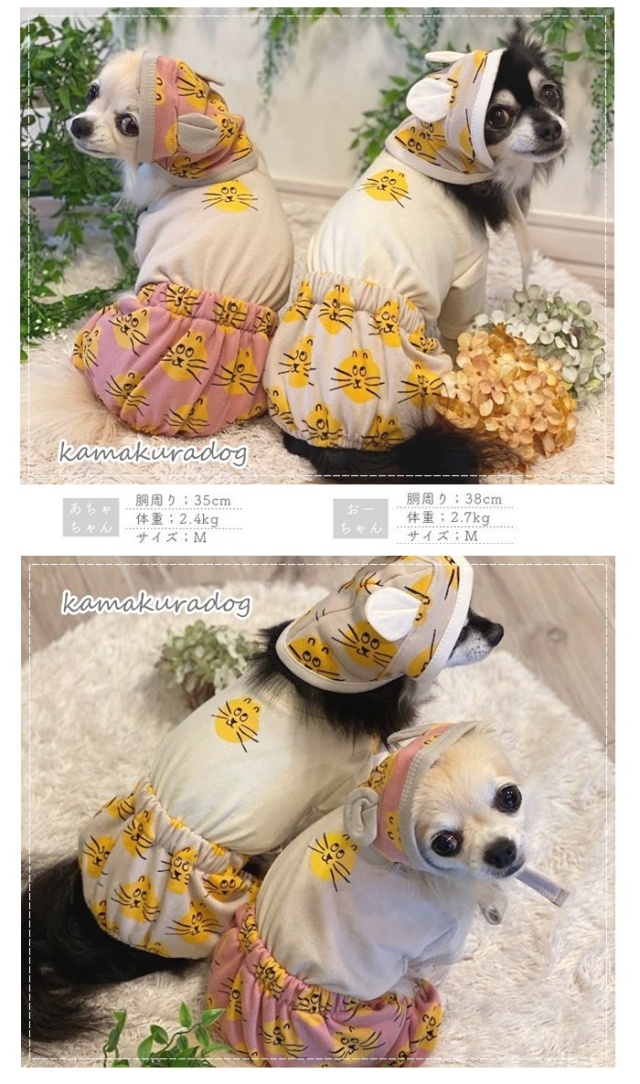 洋服のデザイン、また愛犬の個体差や毛量によって若干サイズが異なる場合がございますので、事前にワンちゃんのサイズを測った上でご検討下さい。