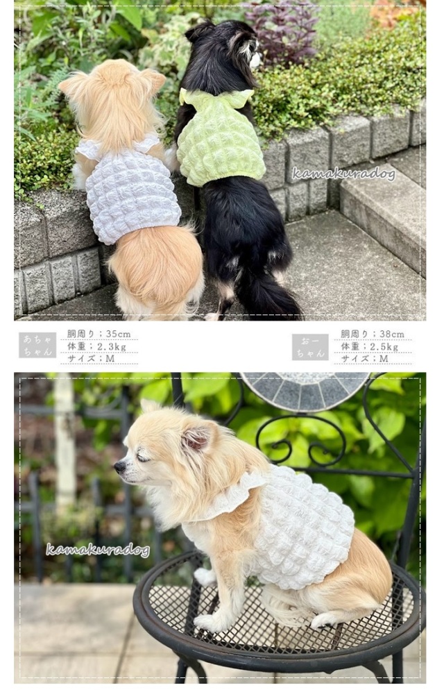 洋服のデザイン、また愛犬の個体差や毛量によって若干サイズが異なる場合がございますので、事前にワンちゃんのサイズを測った上でご検討下さい。