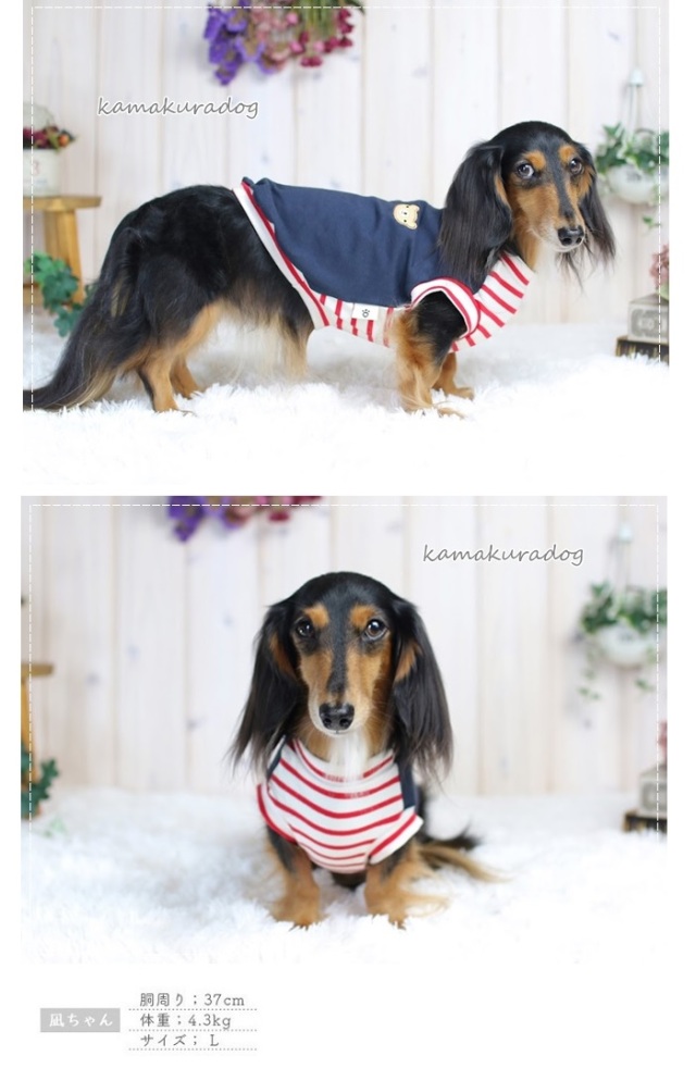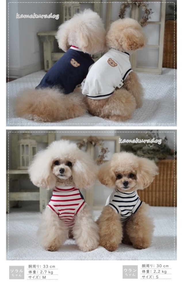 洋服のデザイン、また愛犬の個体差や毛量によって若干サイズが異なる場合がございますので、事前にワンちゃんのサイズを測った上でご検討下さい。