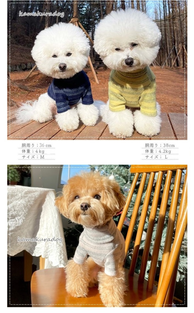 洋服のデザイン、また愛犬の個体差や毛量によって若干サイズが異なる場合がございますので、事前にワンちゃんのサイズを測った上でご検討下さい。