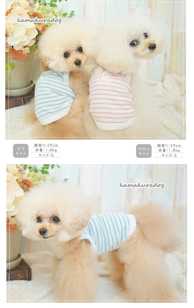 洋服のデザイン、また愛犬の個体差や毛量によって若干サイズが異なる場合がございますので、事前にワンちゃんのサイズを測った上でご検討下さい。