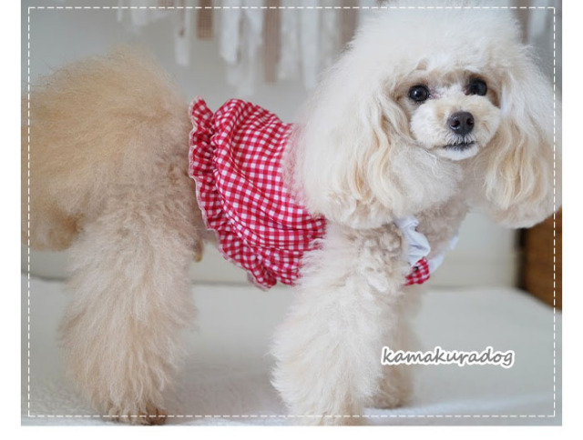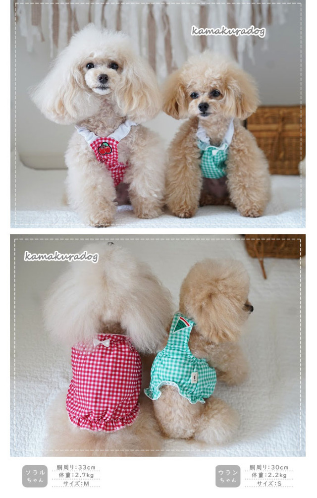 洋服のデザイン、また愛犬の個体差や毛量によって若干サイズが異なる場合がございますので、事前にワンちゃんのサイズを測った上でご検討下さい。