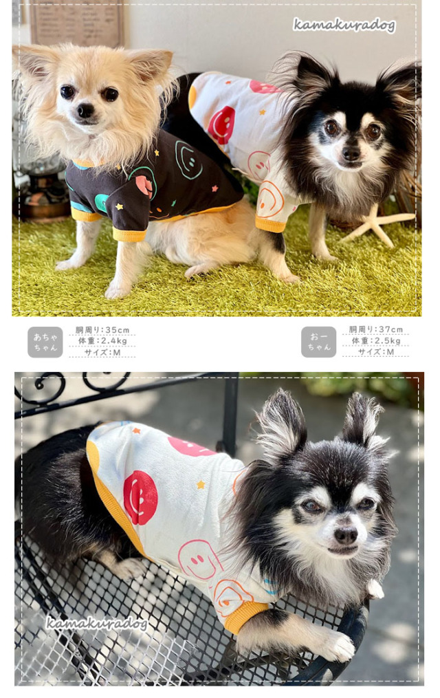 洋服のデザイン、また愛犬の個体差や毛量によって若干サイズが異なる場合がございますので、事前にワンちゃんのサイズを測った上でご検討下さい。