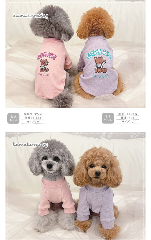 6.6キロ中肉中背マルプーの男の子。Lサイズでちょうど良い感じでした。鎌倉DOGさんで購入する回数が多いのでサイズも迷わず決められます。良い点は、着せる時に伸びるので着せやすいところ。一つ背中側のクマちゃんのプリントがもう少し大きくても可愛かったかな?ミントグリーンは派手すぎずこれから春にぴったりだと思いました。