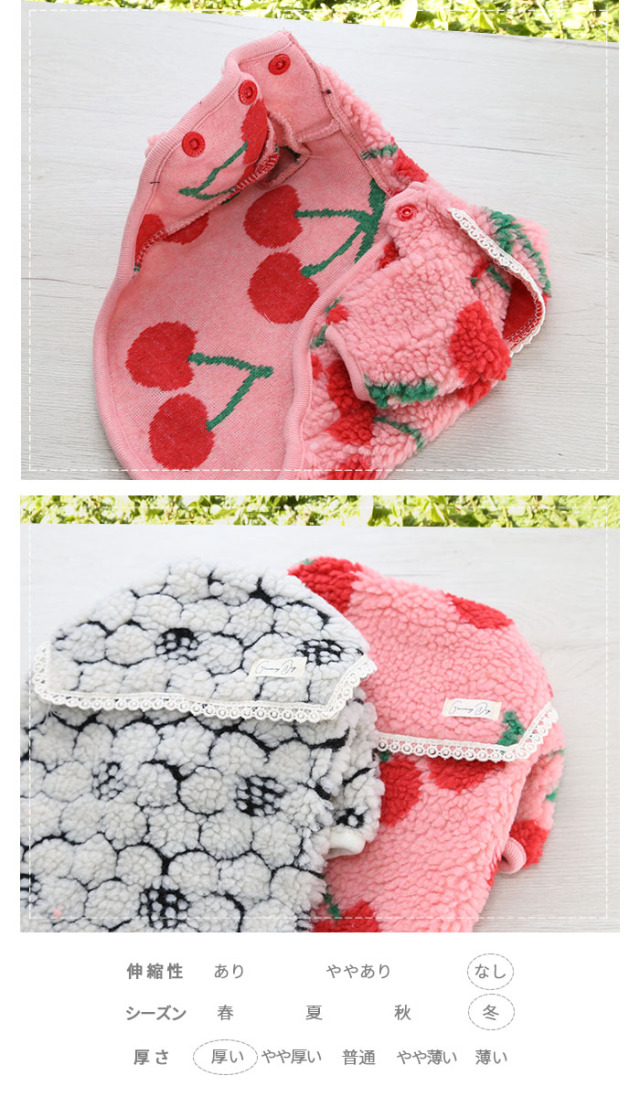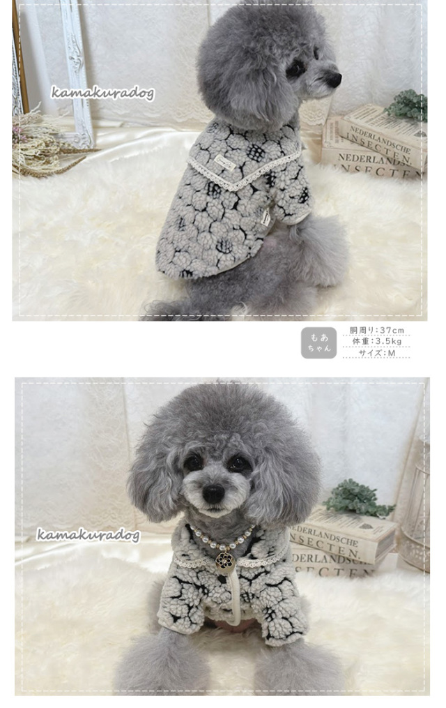 洋服のデザイン、また愛犬の個体差や毛量によって若干サイズが異なる場合がございますので、事前にワンちゃんのサイズを測った上でご検討下さい。
