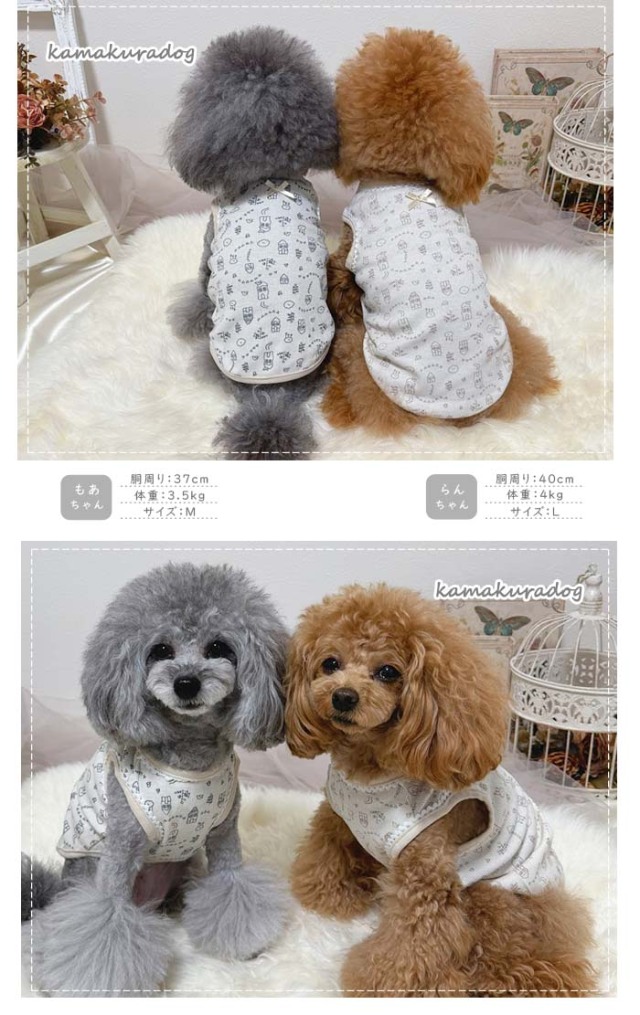 洋服のデザイン、また愛犬の個体差や毛量によって若干サイズが異なる場合がございますので、事前にワンちゃんのサイズを測った上でご検討下さい。