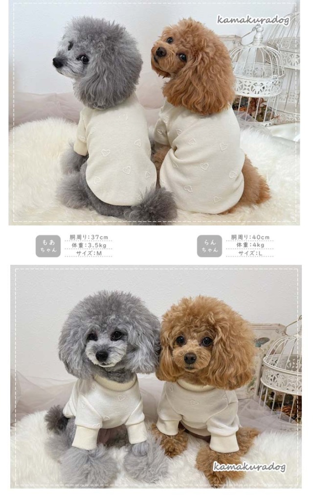 洋服のデザイン、また愛犬の個体差や毛量によって若干サイズが異なる場合がございますので、事前にワンちゃんのサイズを測った上でご検討下さい。