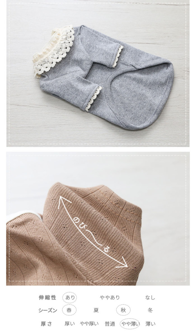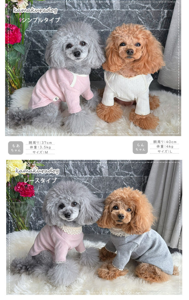 洋服のデザイン、また愛犬の個体差や毛量によって若干サイズが異なる場合がございますので、事前にワンちゃんのサイズを測った上でご検討下さい。
