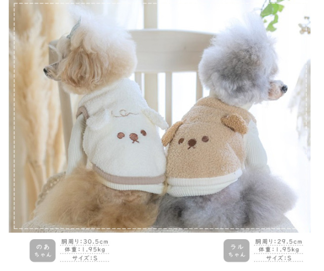 洋服のデザイン、また愛犬の個体差や毛量によって若干サイズが異なる場合がございますので、事前にワンちゃんのサイズを測った上でご検討下さい。