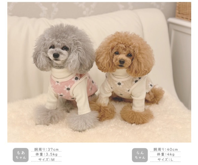 洋服のデザイン、また愛犬の個体差や毛量によって若干サイズが異なる場合がございますので、事前にワンちゃんのサイズを測った上でご検討下さい。