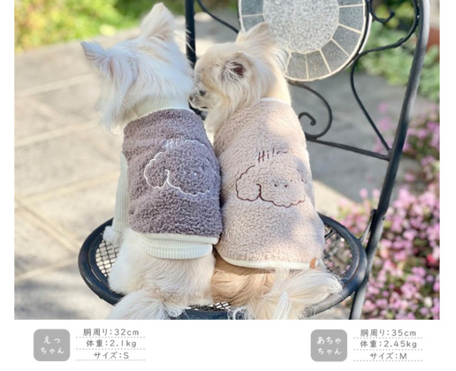 洋服のデザイン、また愛犬の個体差や毛量によって若干サイズが異なる場合がございますので、事前にワンちゃんのサイズを測った上でご検討下さい。