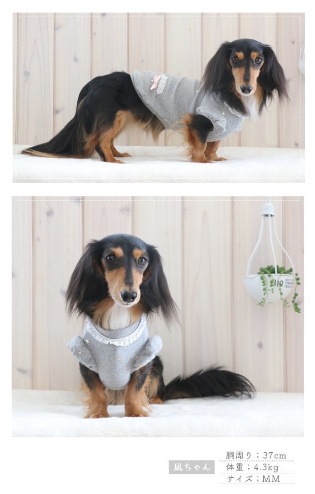 洋服のデザイン、また愛犬の個体差や毛量によって若干サイズが異なる場合がございますので、事前にワンちゃんのサイズを測った上でご検討下さい。