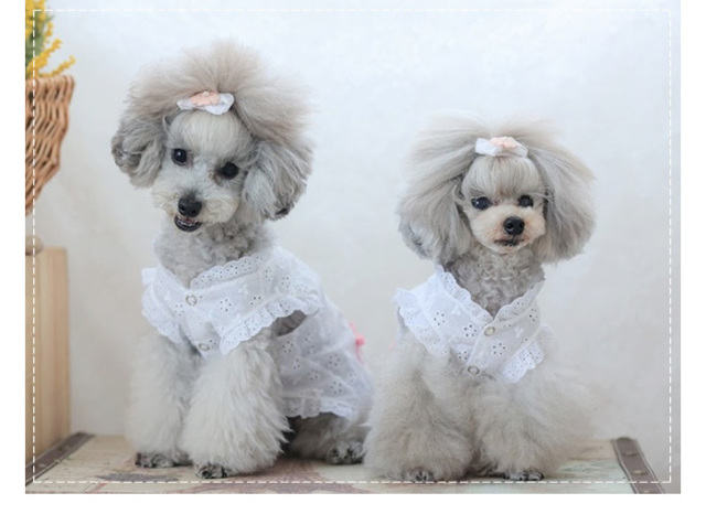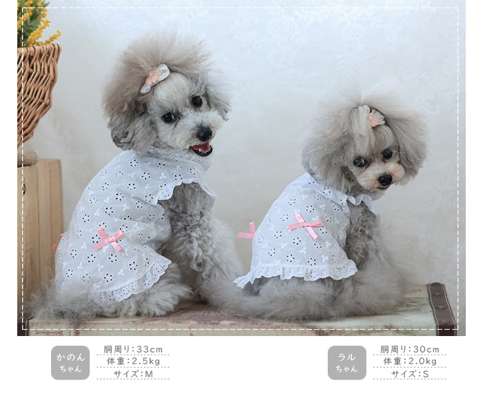 洋服のデザイン、また愛犬の個体差や毛量によって若干サイズが異なる場合がございますので、事前にワンちゃんのサイズを測った上でご検討下さい。