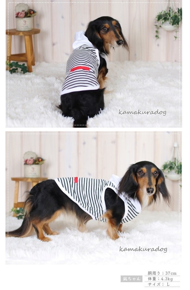 洋服のデザイン、また愛犬の個体差や毛量によって若干サイズが異なる場合がございますので、事前にワンちゃんのサイズを測った上でご検討下さい。