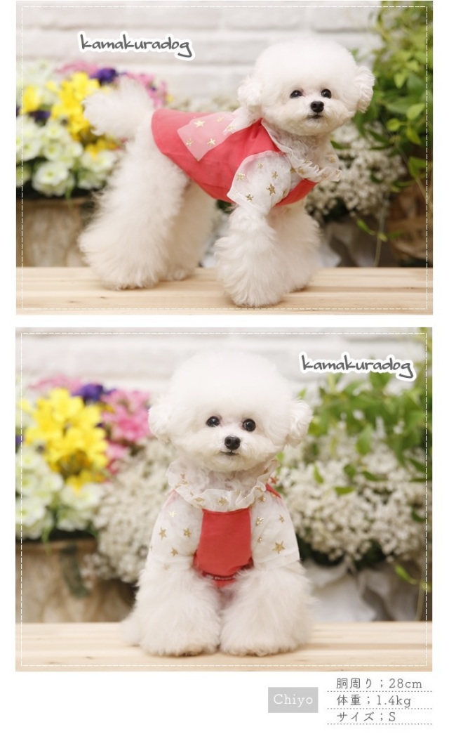 洋服のデザイン、また愛犬の個体差や毛量によって若干サイズが異なる場合がございますので、事前にワンちゃんのサイズを測った上でご検討下さい。