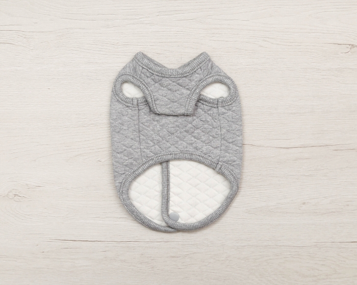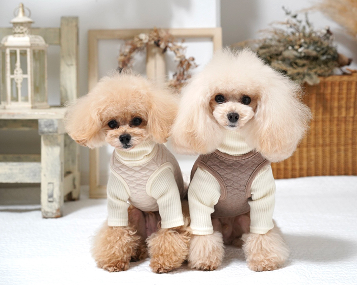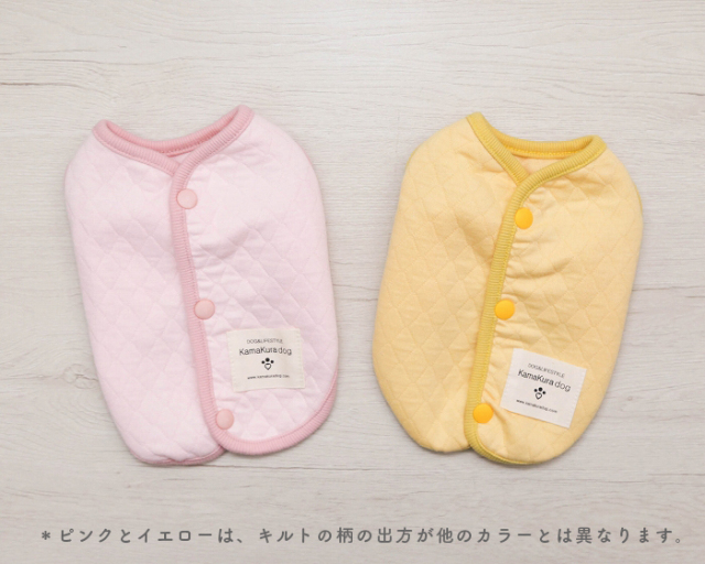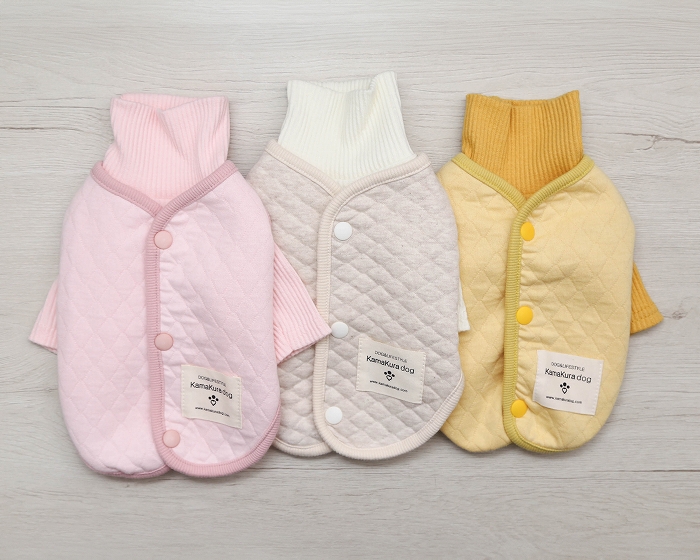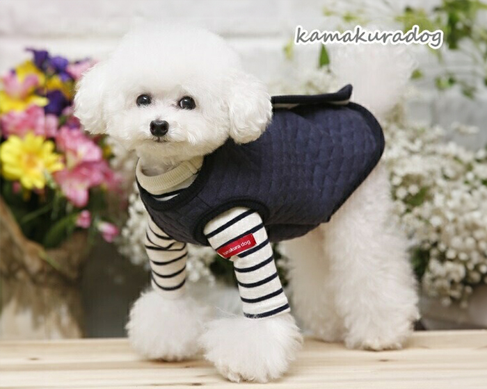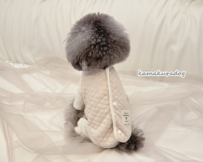 ボタンが背中側にあるので、着せるのも楽ちんだし、素材がキルトなので春まで長く使えそうです。一緒に買ったベージュのボーダーつなぎとセットで着せるとアプリコットのトイプードルにベストマッチでした。 |