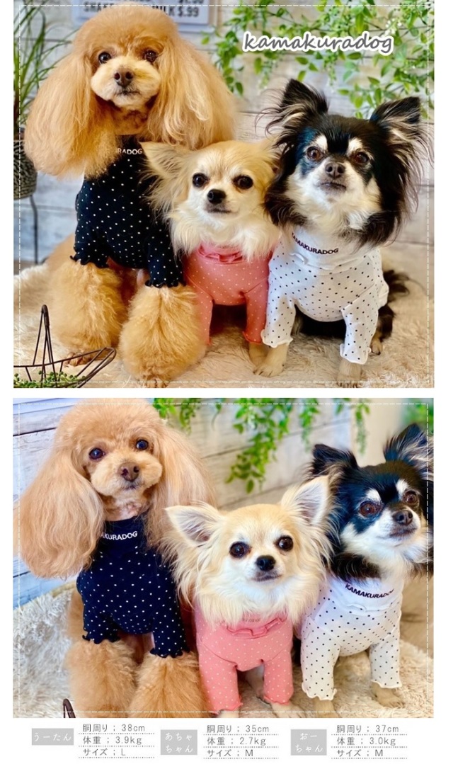 洋服のデザイン、また愛犬の個体差や毛量によって若干サイズが異なる場合がございますので、事前にワンちゃんのサイズを測った上でご検討下さい。