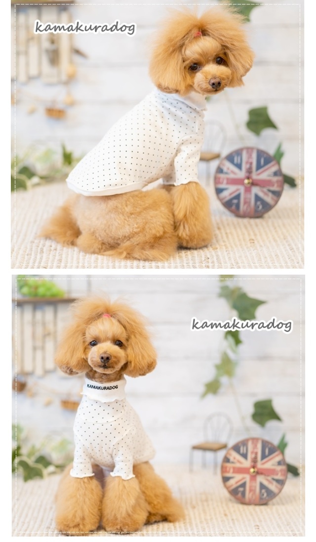 首や手足が長いプードルにデザインとドット柄がすごく似合ってます。 |