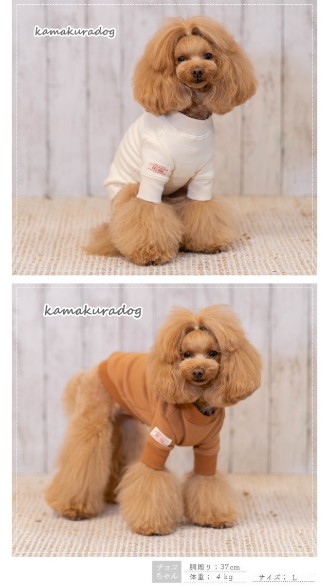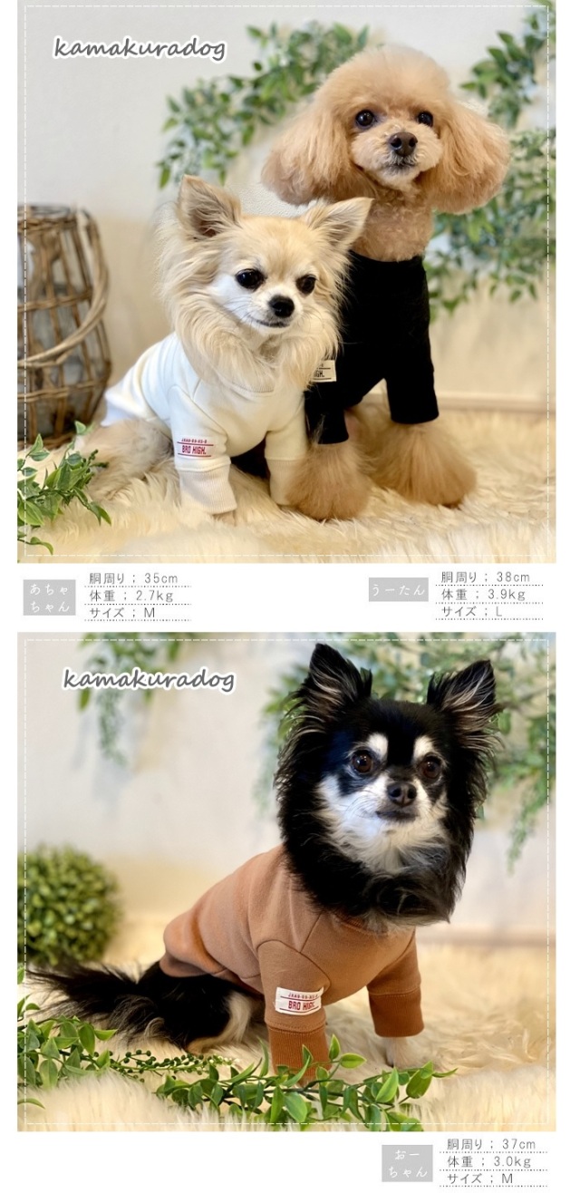 洋服のデザイン、また愛犬の個体差や毛量によって若干サイズが異なる場合がございますので、事前にワンちゃんのサイズを測った上でご検討下さい。