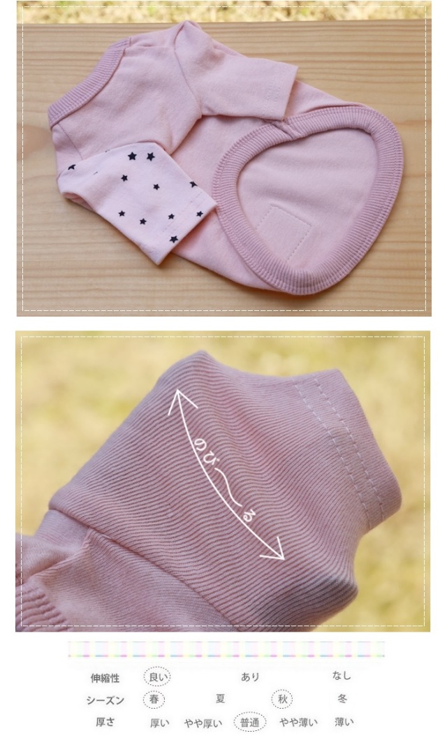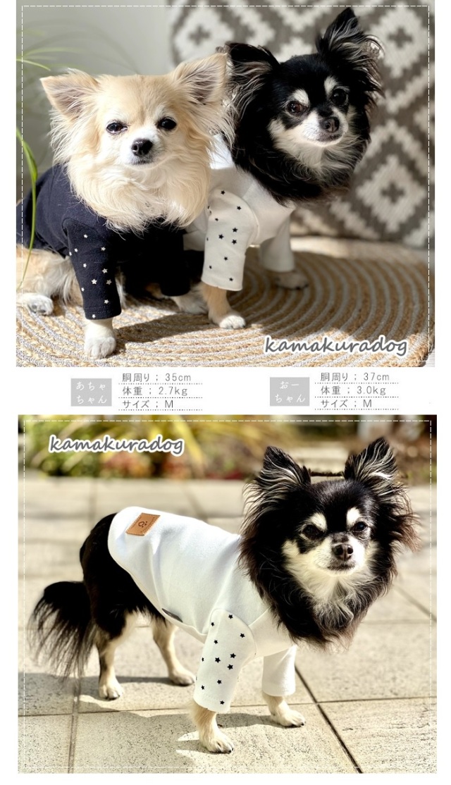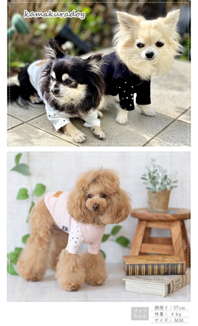 洋服のデザイン、また愛犬の個体差や毛量によって若干サイズが異なる場合がございますので、事前にワンちゃんのサイズを測った上でご検討下さい。