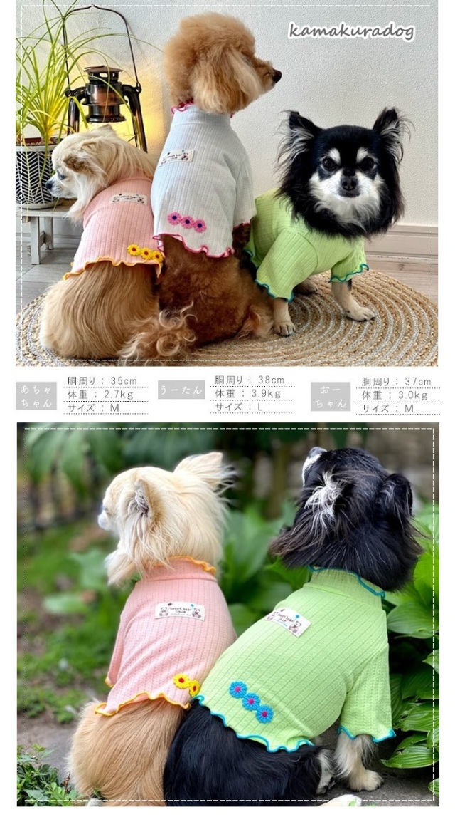 洋服のデザイン、また愛犬の個体差や毛量によって若干サイズが異なる場合がございますので、事前にワンちゃんのサイズを測った上でご検討下さい。