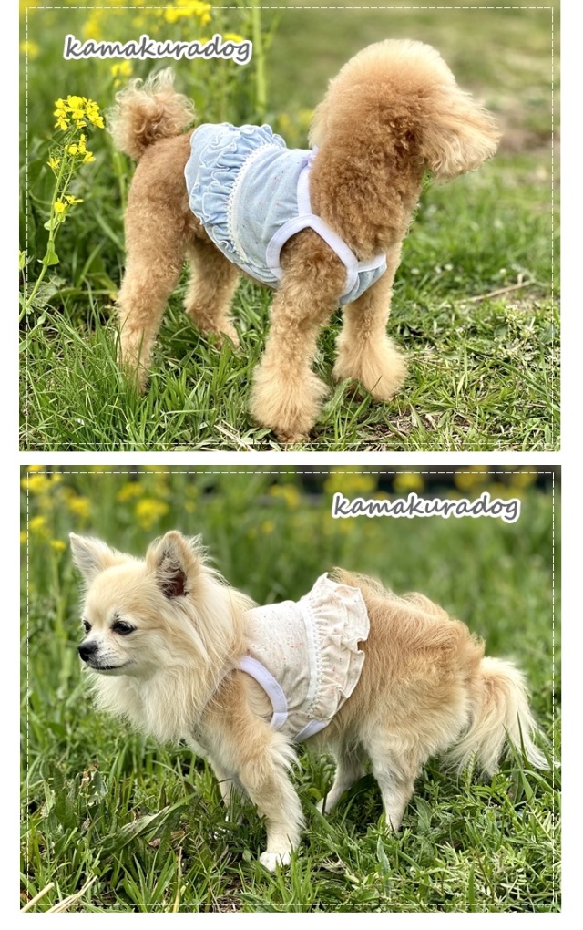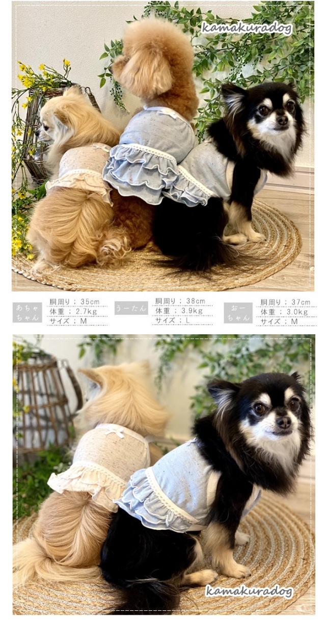 洋服のデザイン、また愛犬の個体差や毛量によって若干サイズが異なる場合がございますので、事前にワンちゃんのサイズを測った上でご検討下さい。