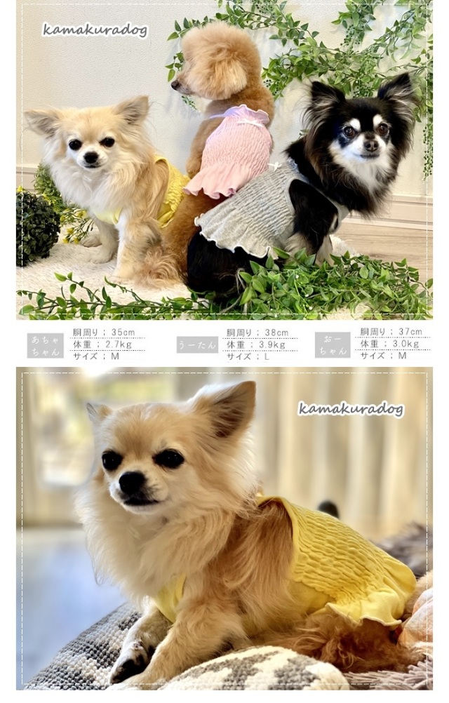 洋服のデザイン、また愛犬の個体差や毛量によって若干サイズが異なる場合がございますので、事前にワンちゃんのサイズを測った上でご検討下さい。