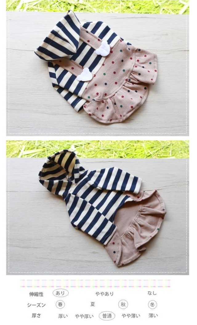 洋服のデザイン、また愛犬の個体差や毛量によって若干サイズが異なる場合がございますので、事前にワンちゃんのサイズを測った上でご検討下さい。