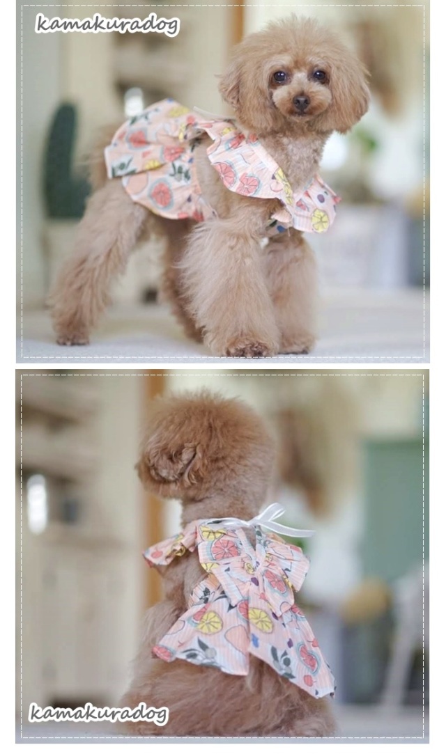 洋服のデザイン、また愛犬の個体差や毛量によって若干サイズが異なる場合がございますので、事前にワンちゃんのサイズを測った上でご検討下さい。