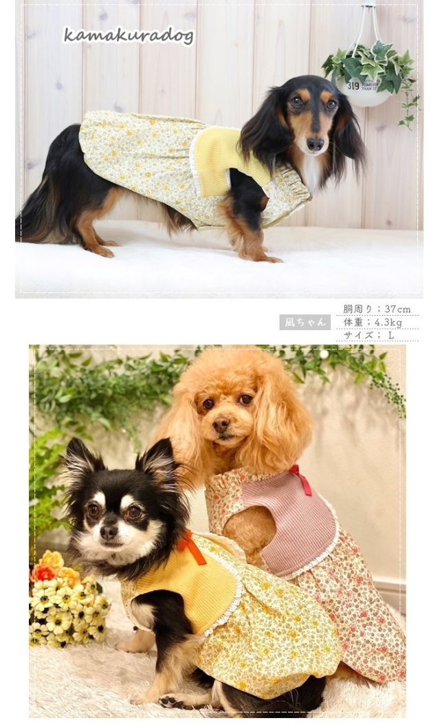 洋服のデザイン、また愛犬の個体差や毛量によって若干サイズが異なる場合がございますので、事前にワンちゃんのサイズを測った上でご検討下さい。